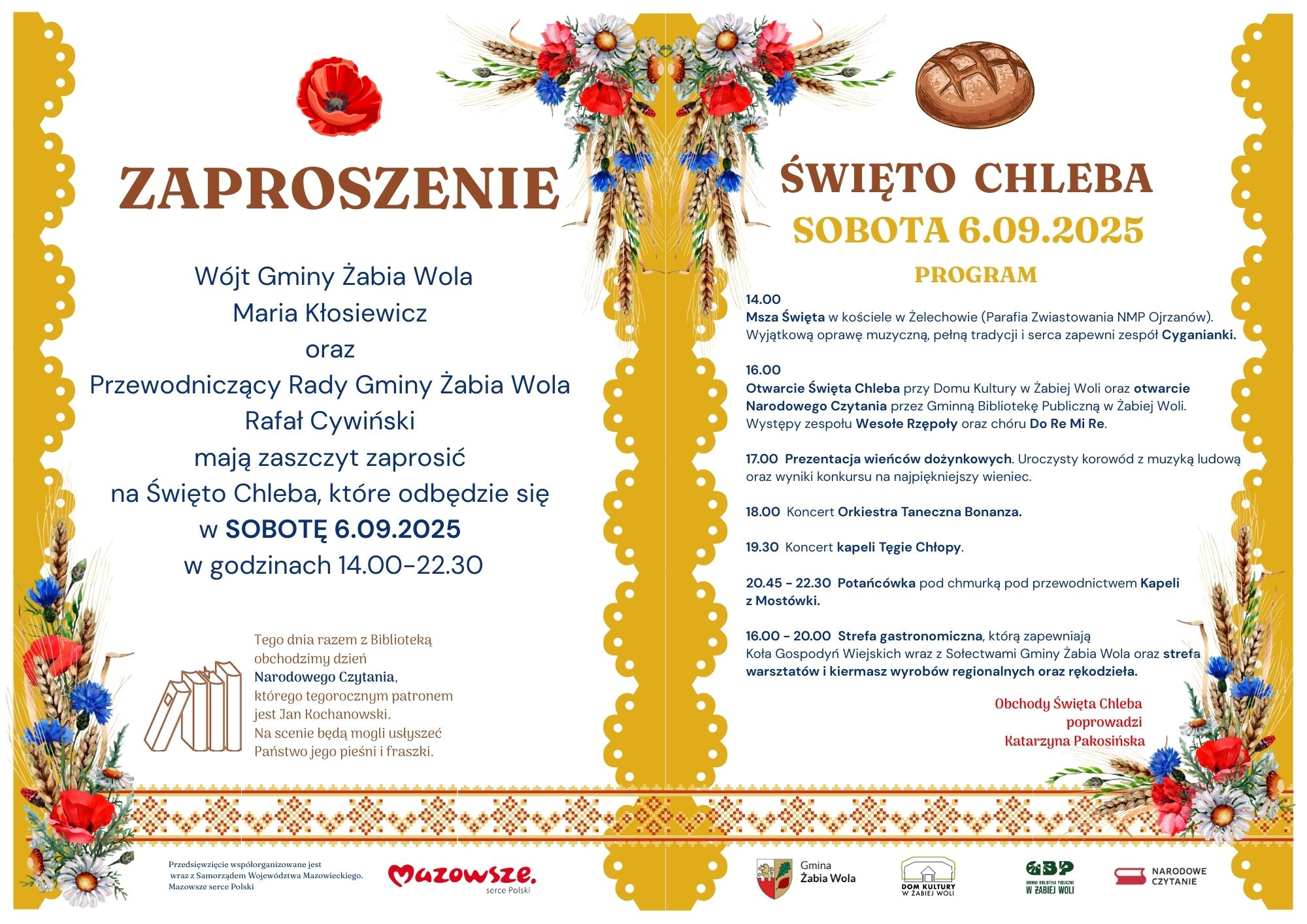 14:00 - 22:30 Święto Chleba w Żabiej Woli 2025 6 września, 2025: 14:00 - 22:30 Święto Chleba w Żabiej Woli 2025 Święto Chleba w Żabiej Woli Wójt Gminy Żabia Wola oraz Przewodniczący Rady Gminymają zaszczyt zaprosić mieszkańców i gości na wyjątkowe […] 30zł